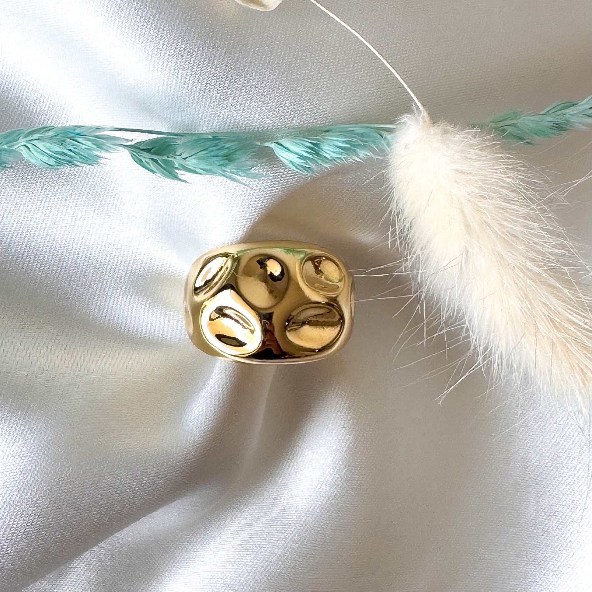 Este anillo robusto presenta un diseño con pequeñas honduras que aportan textura y carácter, realzado y elaborado de acero inoxidable con baño de oro de 18K, que garantiza un acabado duradero y elegante. Ideal para quienes buscan una pieza resistente y sofisticada que destaque por su calidad y estilo atemporal.