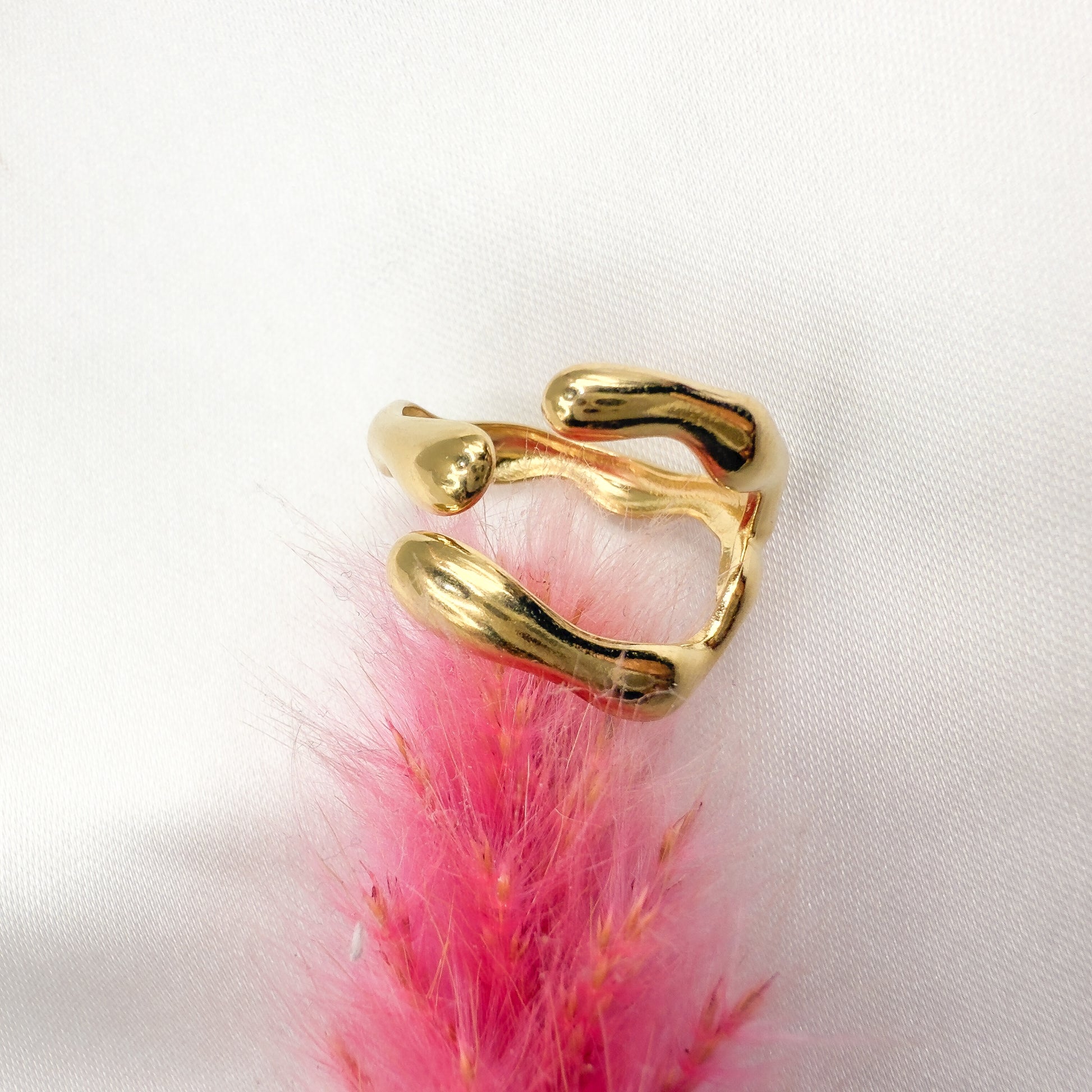 Este anillo, elaborado en bronce bañado en oro de 18k. Su acabado de alta calidad garantiza un brillo prolongado, mientras que su estructura ofrece un ajuste cómodo y seguro. Ideal para quienes buscan una pieza sofisticada.