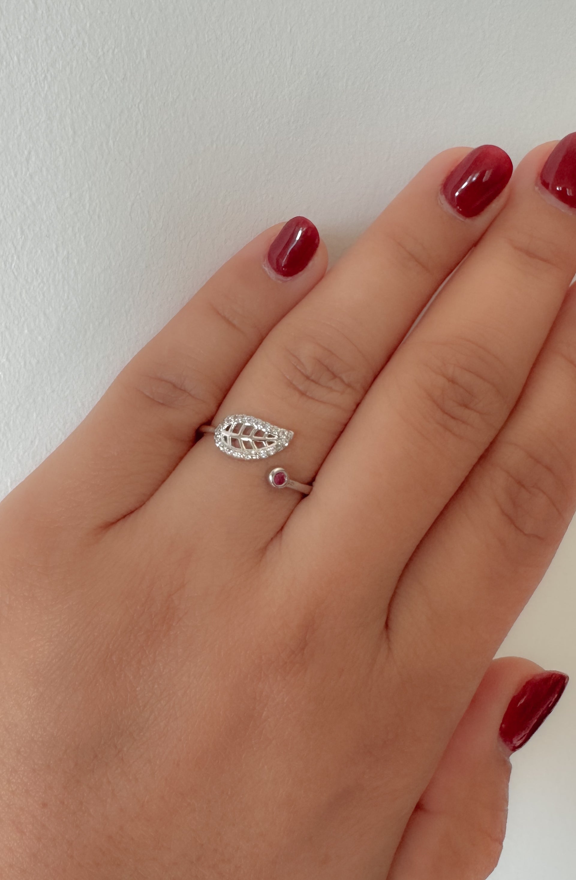 Hermoso, anillo, sencillo, ideal para cualquier ocasión con forma de hoja con circo es blancos y un hermoso punto de color fucsia que le da un toque especial, ideal para cualquier ocasión especial a base de acero inoxidable, con baño de plata.