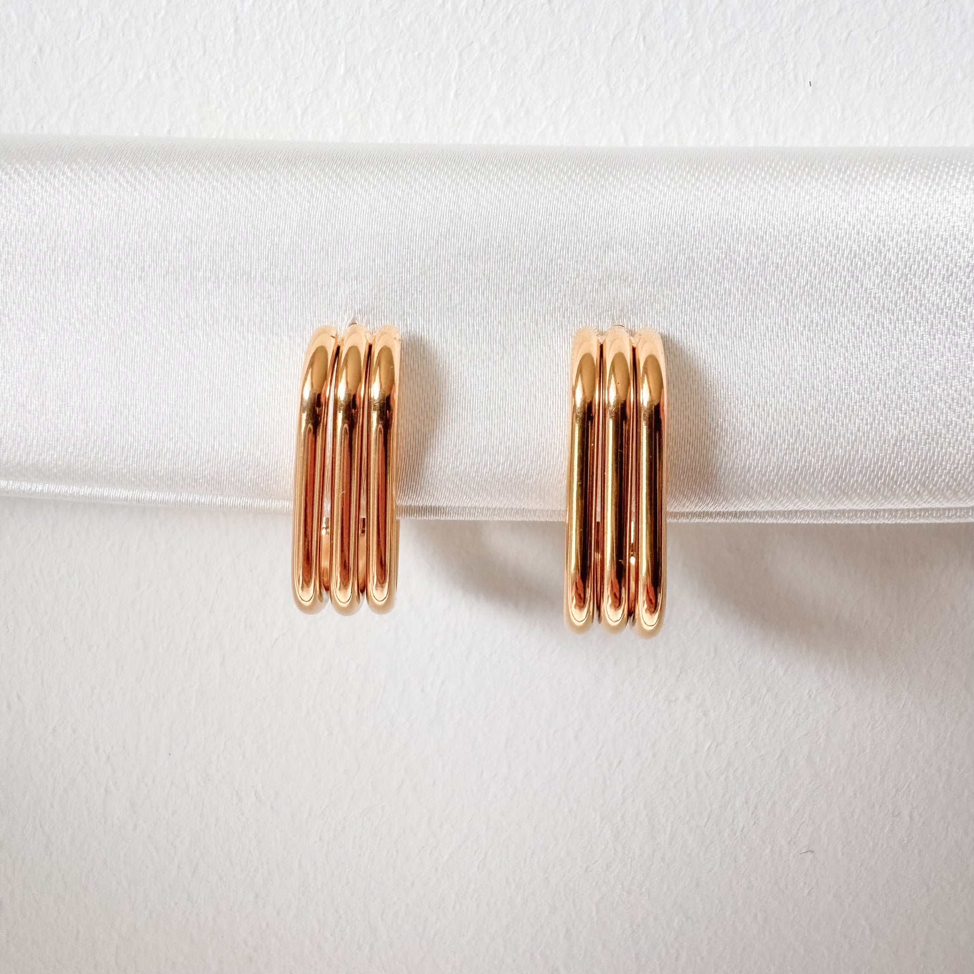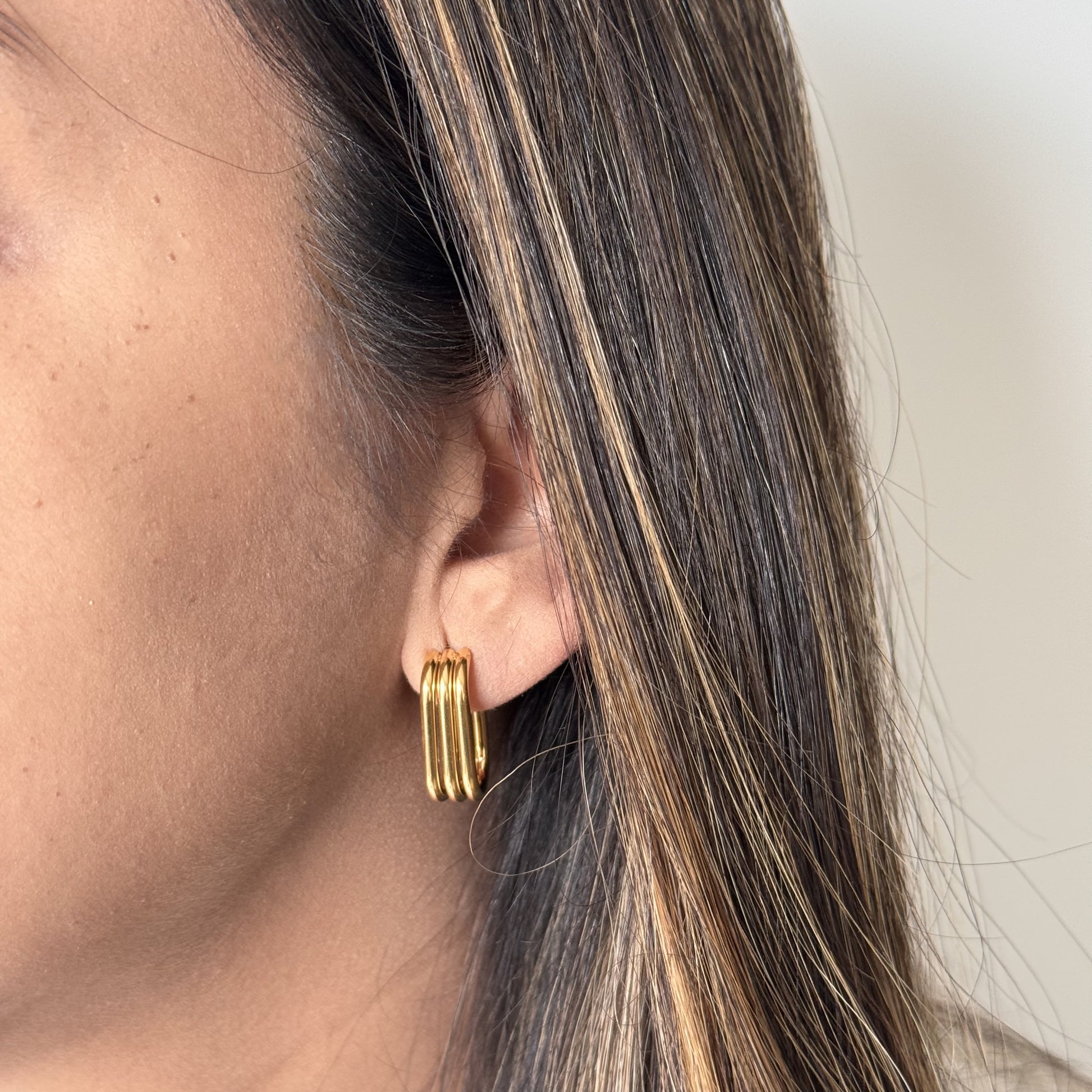 Los Aros Clarte combinan la resistencia del acero inoxidable con un elegante enchapado en oro 18k, diseñados en tres líneas unidas verticalmente. Su estructura única aporta un estilo contemporáneo y sofisticado, perfecto para quienes buscan una joya duradera que realce cualquier atuendo con un toque de distinción.