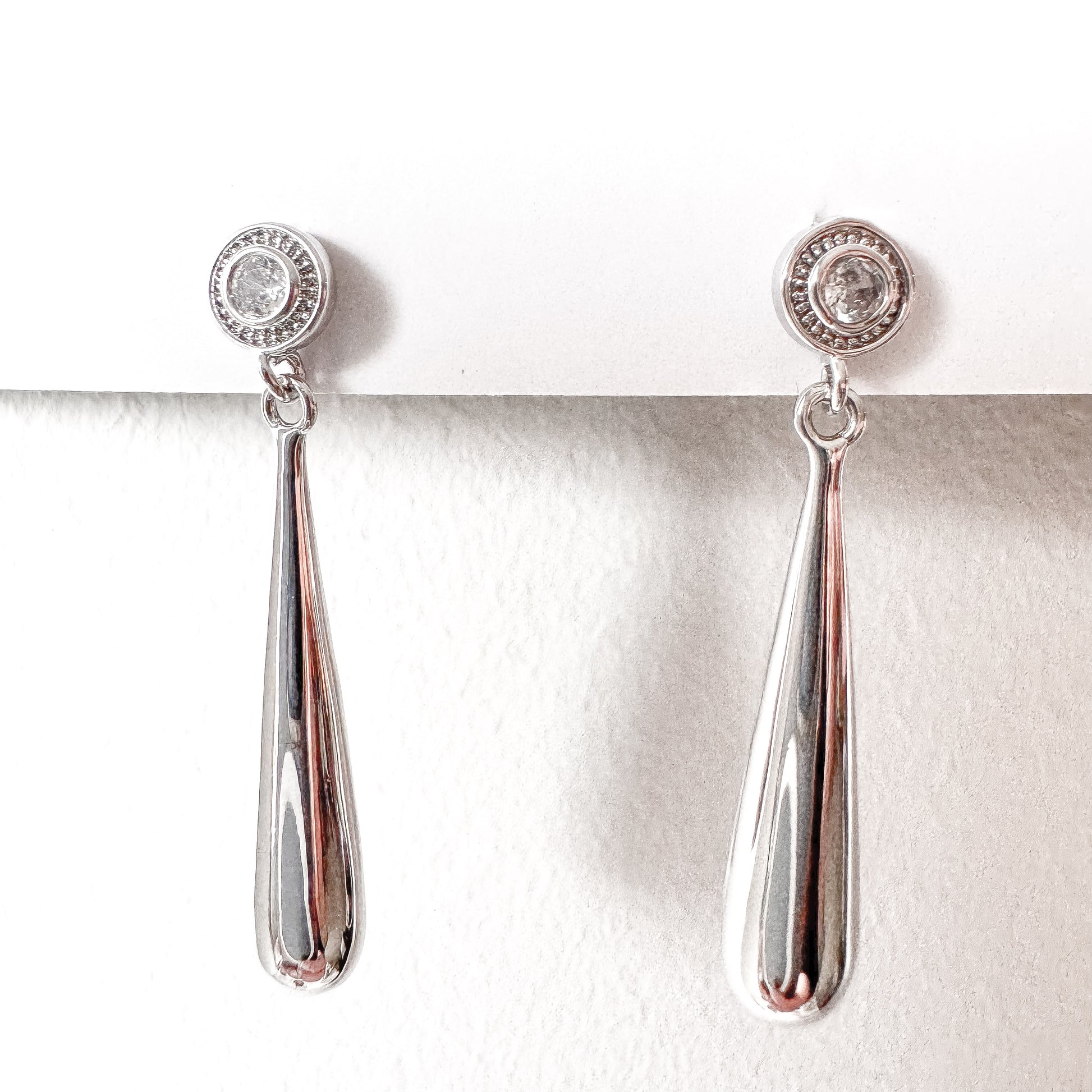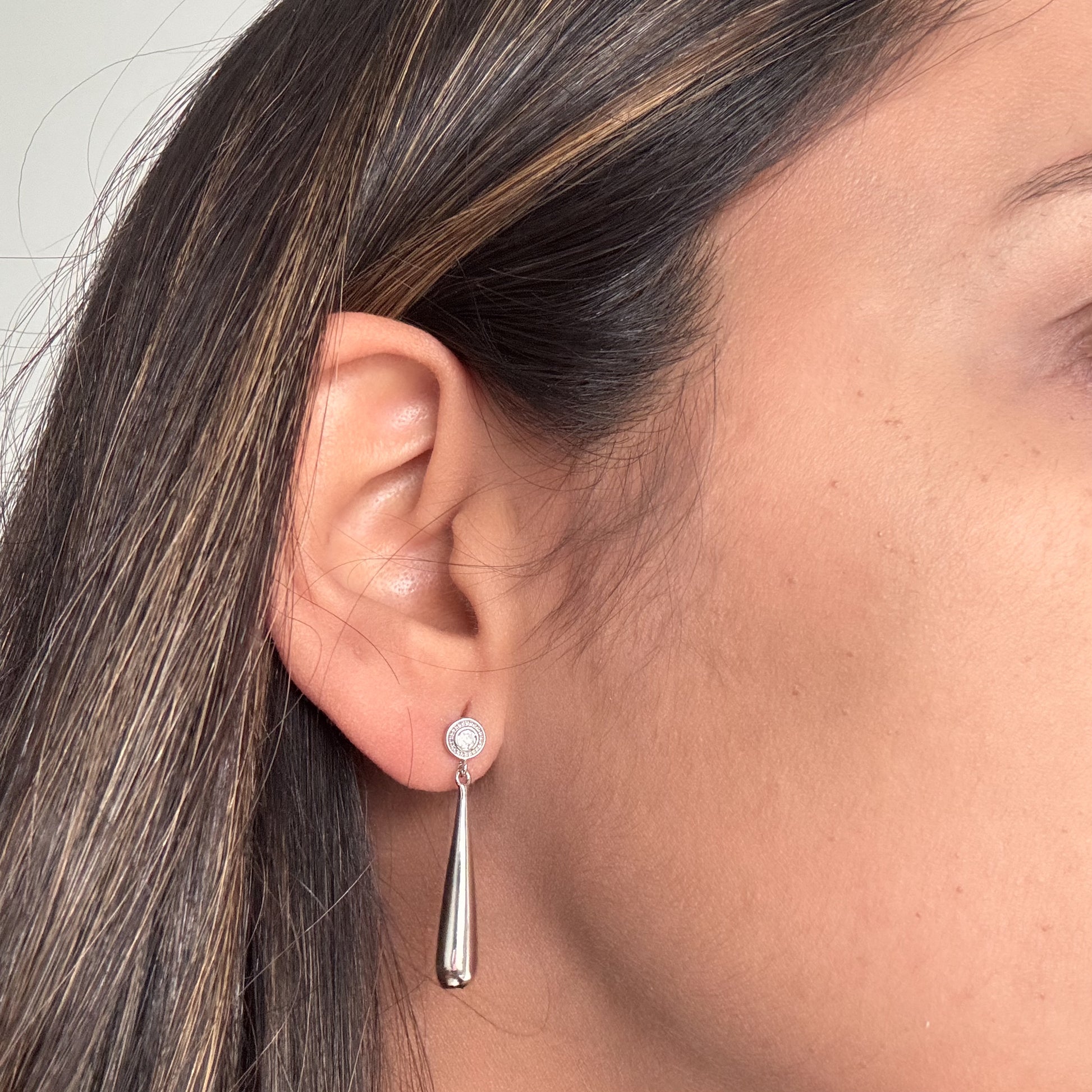 Estos aros en forma de gota alargada están elaborados en acero inoxidable con brillante con un delicado baño de plata, que garantiza durabilidad y un acabado elegante. Su diseño estilizado aporta sofisticación y versatilidad, ideal para complementar tanto looks formales como casuales con un toque moderno y refinado.