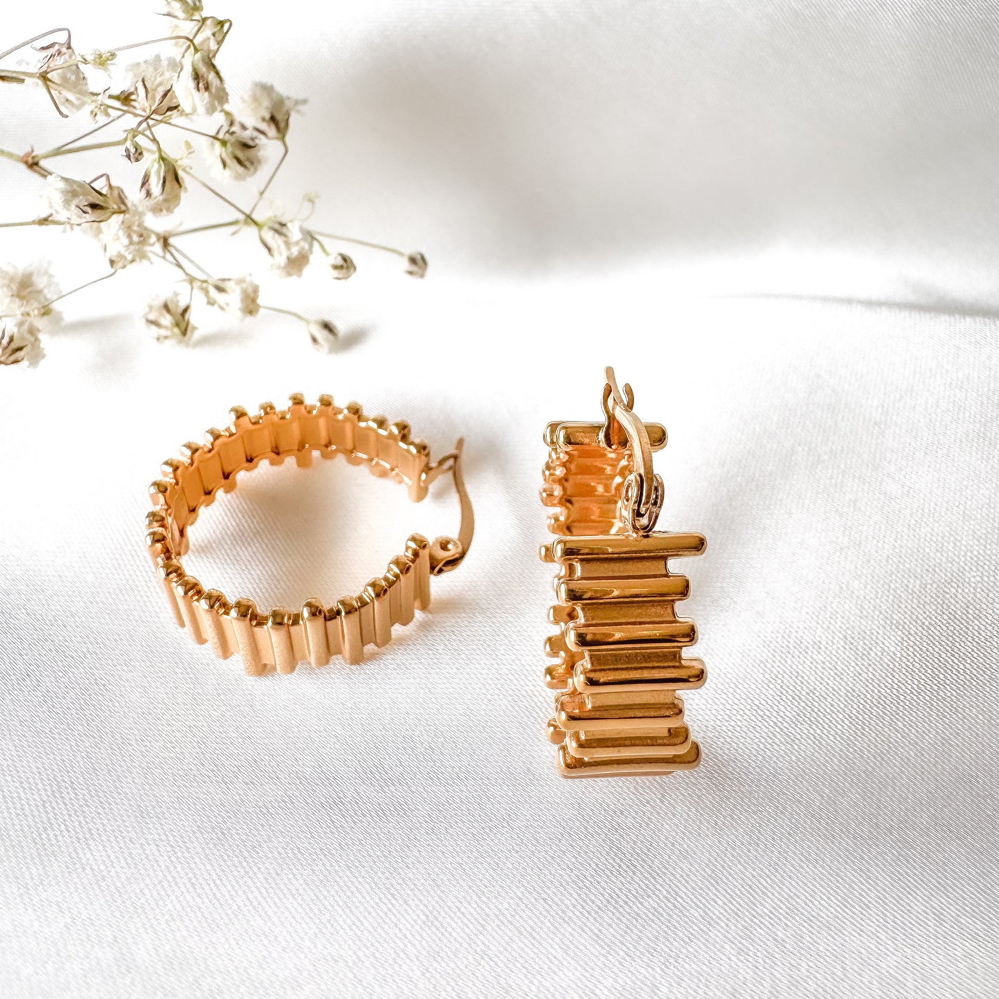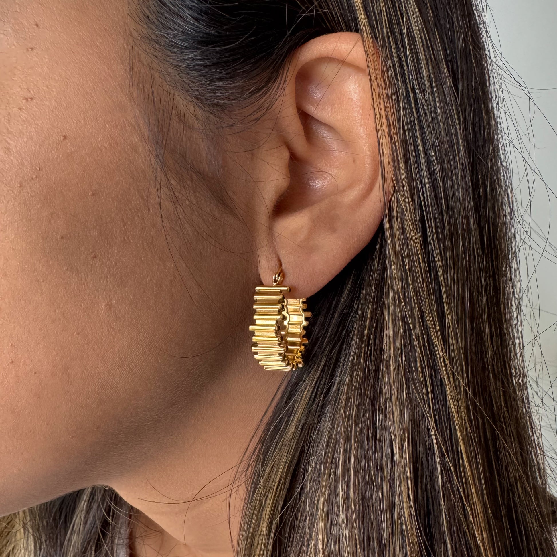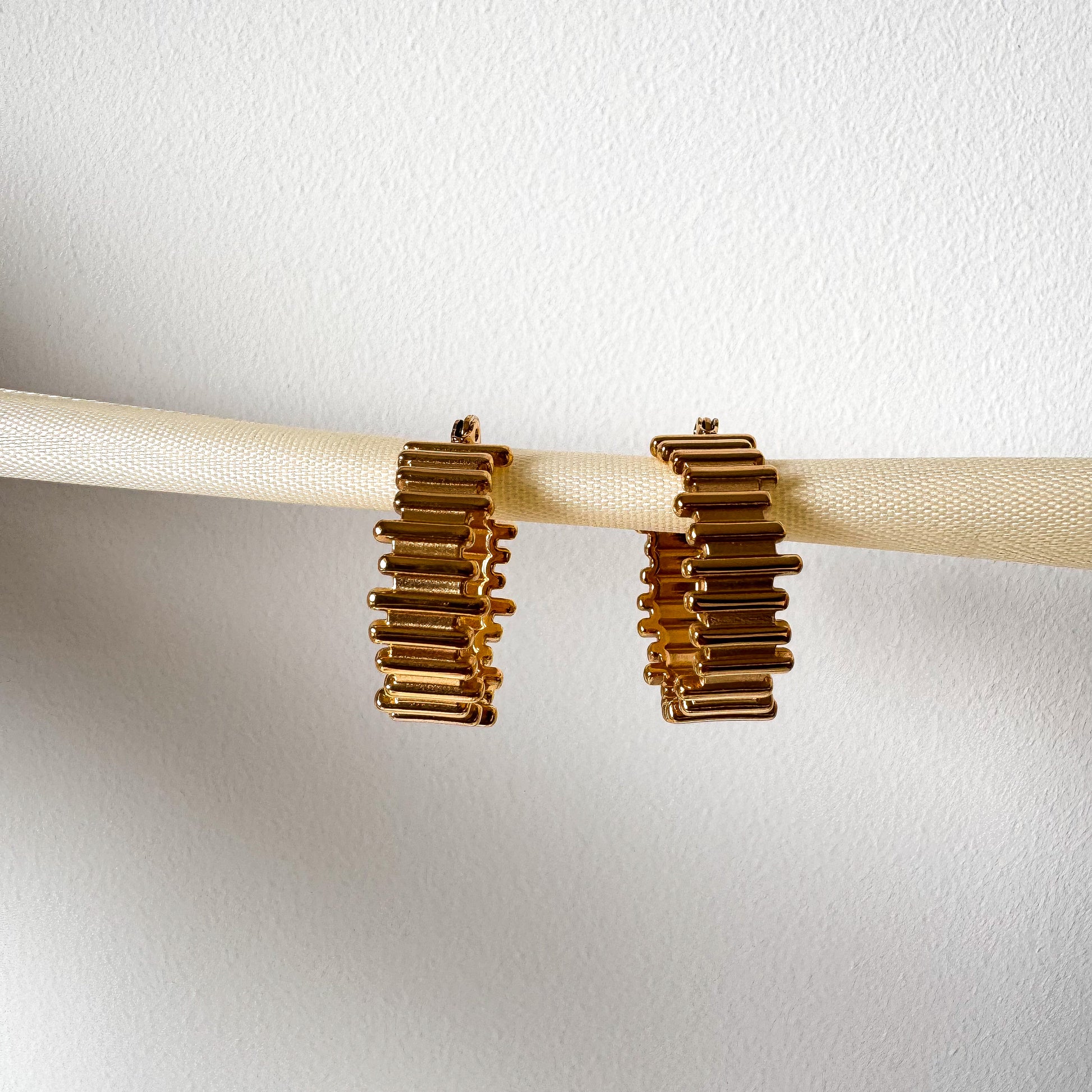 Estos aros Lune, elaborados en acero inoxidable con delicado enchapado en oro 18K, presentan un diseño lineal y horizontal que aporta un toque moderno y sofisticado. Su acabado pulido garantiza durabilidad elegante, ideal para complementar cualquier estilo con un detalle sutil pero distintivo. Perfectos para quienes buscan una joya versátil y de calidad.
