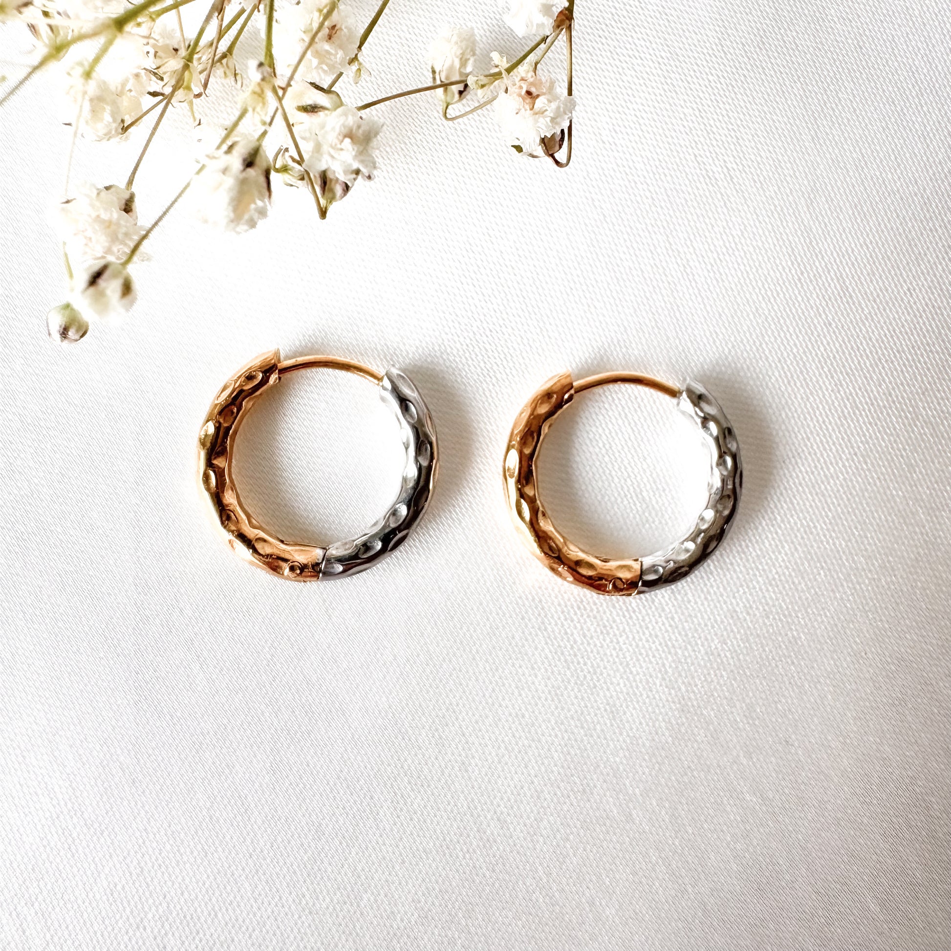 Estas pequeñas argollas combinan la calidez del acero inoxidable con enchapado de oro de 18k y la resistencia del acero con baño de plata, ofreciendo un diseño sofisticado y duradero. Perfectas para quienes buscan simplicidad y calidad en un accesorio versátil y atemporal.