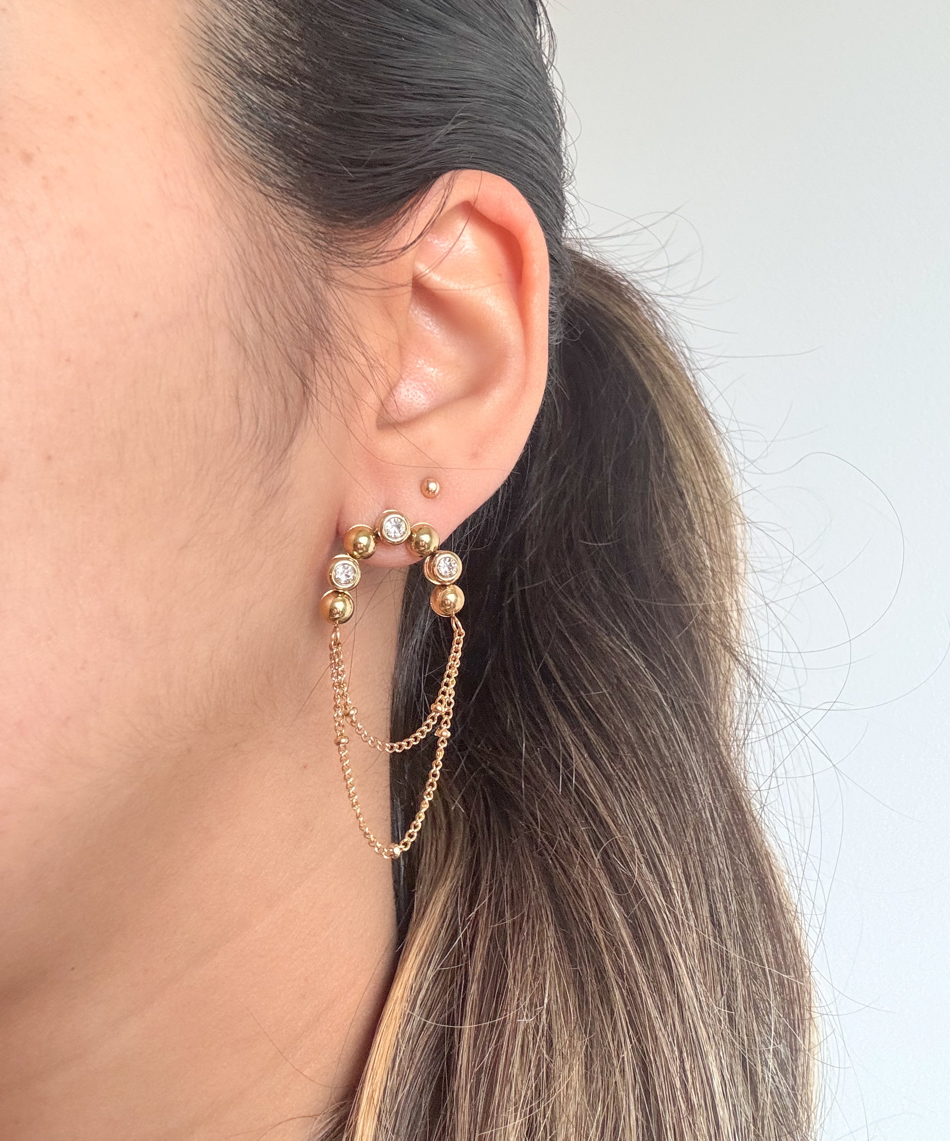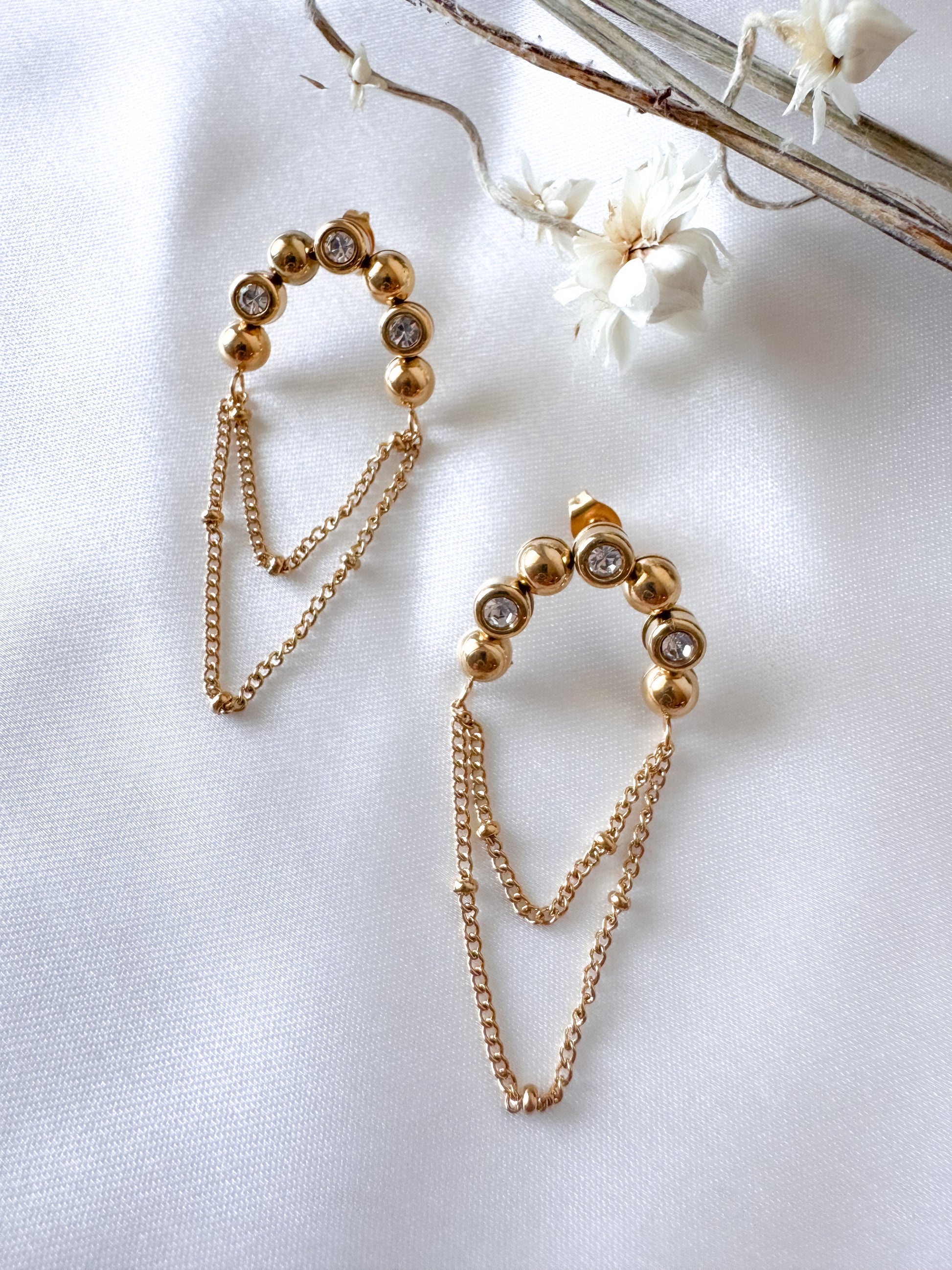 Estos aros destello, enchapados en oro 18k de alta calidad, combinan dos cadenas colgantes con tres puntos de luz, creando un diseño sofisticado ideal para ocasiones especiales. Su estilo tipo cóctel aporta elegancia sutil, convirtiéndolos en un accesorio perfecto para realzar cualquier look con un toque de distinción y delicadeza.