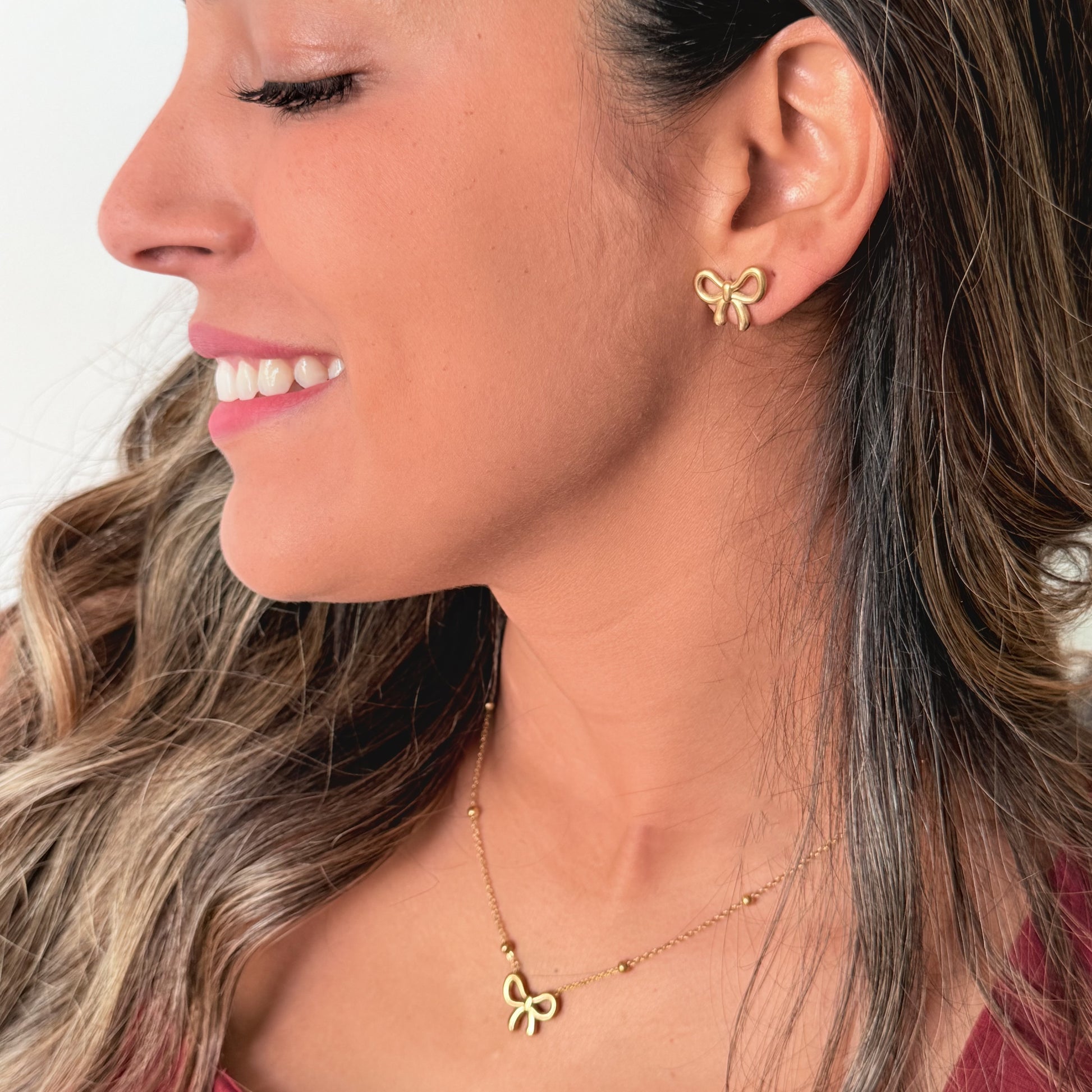 Collar Encanto Real ofrece un conjunto sofisticado con diseño de lazo, caracterizados por su elegante simplicidad. Elaborado en acero inoxidable con enchape en oro 18k, este conjunto presenta líneas limpias y un acabado pulido que realza su estética minimalista.