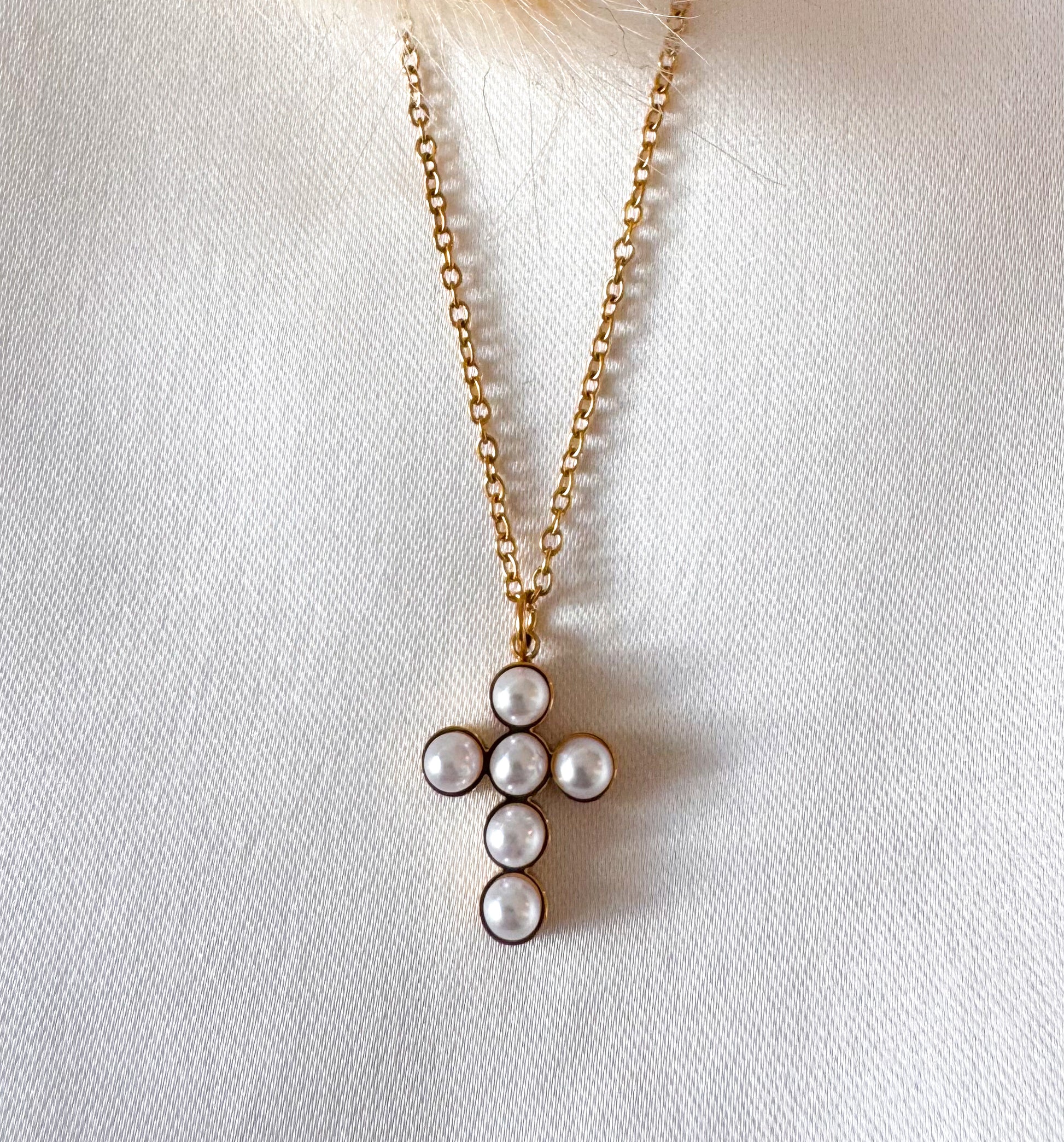Este Hermoso collar Eterna con dije de cruz y perlas naturales es el accesorio perfecto para nuestro día a día, ya que agrega un toque elegante y sofisticado a cualquier outfit. Además, su enchapado en oro 18k garantiza su durabilidad y calidad.
