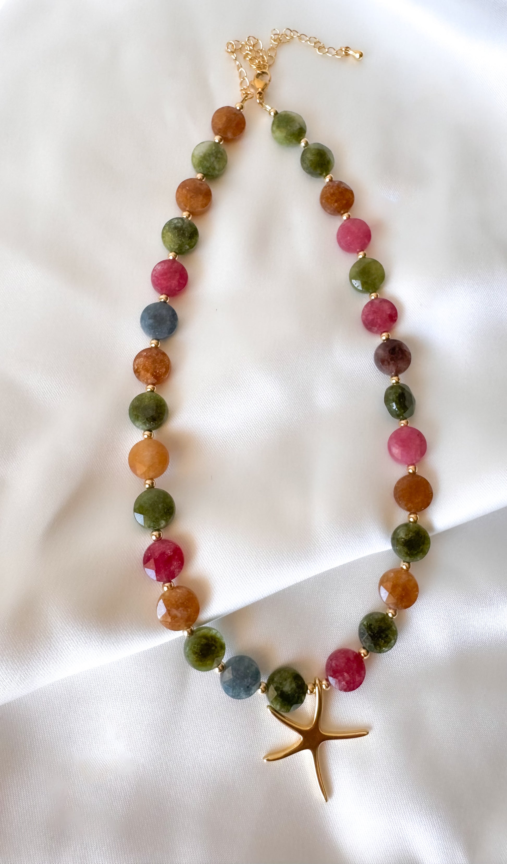 Este Collar Magnolia es una elegante pieza adornada con piedras naturales llenas de color y estilo. El dije en forma de estrella lo hace ideal para complementar tus atuendos en tardes elegantes. ¡Añade un toque de elegancia a tu look con este collar único y sofisticado!