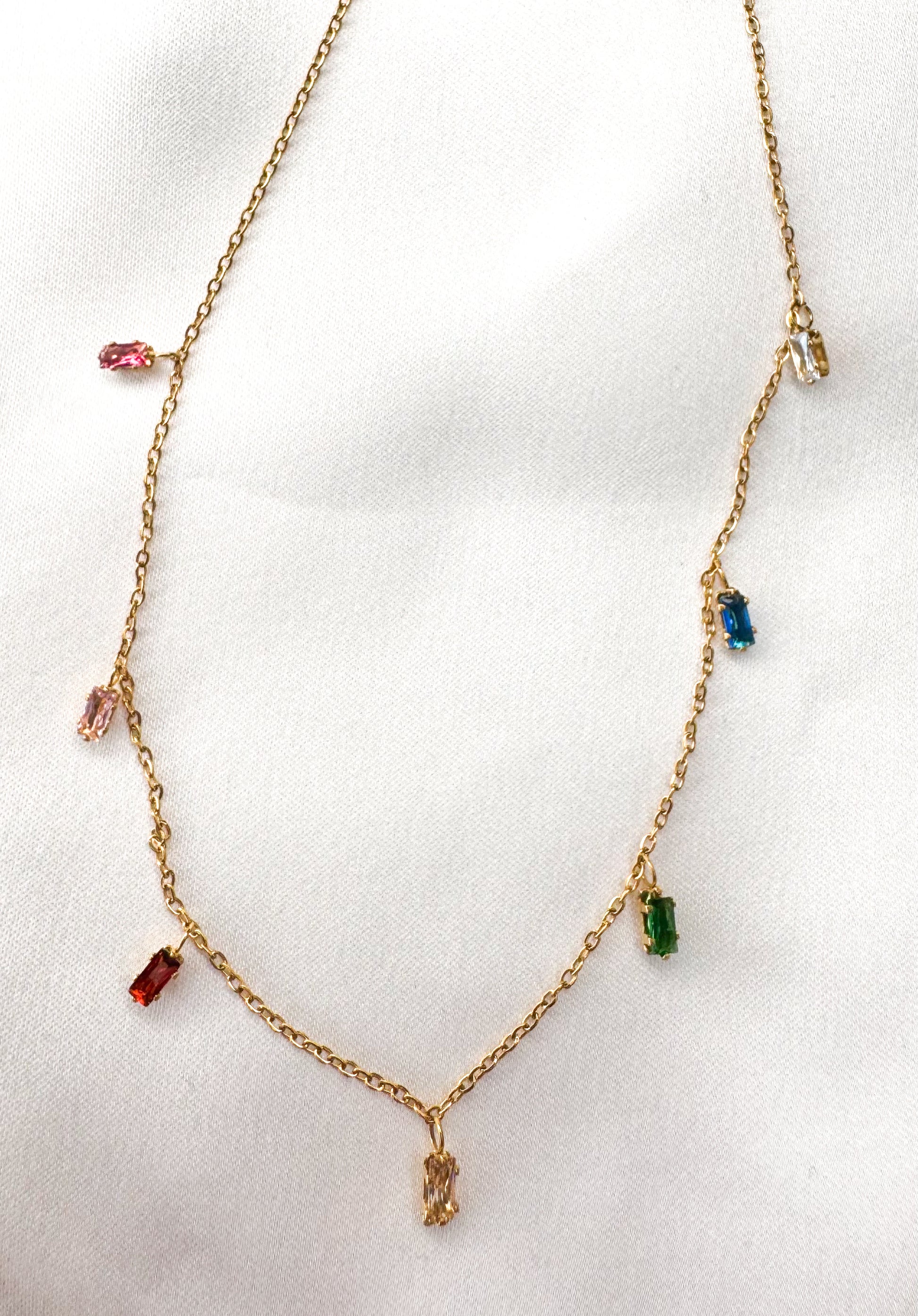 Disfruta de la elegancia con nuestro collar chapado en oro 18k con circones de colores brillantes. Este collar moderno te hará destacar y complementará cualquier atuendo con su delicado brillo. Hecho con materiales de alta calidad, este collar es una excelente opción para aquellos que buscan estilo y sofisticación.