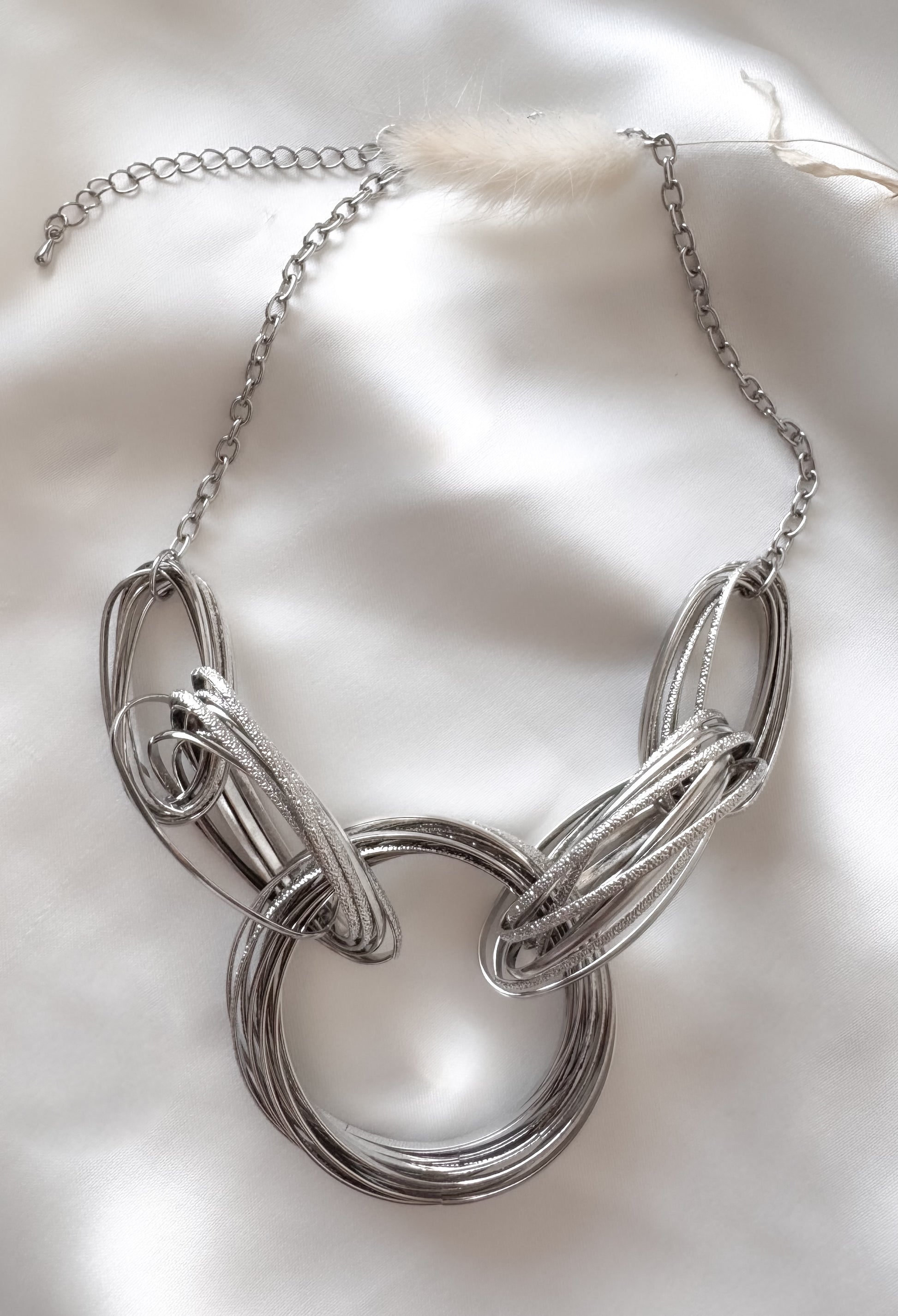 "Con el Collar Rebelde, llevarás la elegancia a un nivel superior. Este collar de círculos y óvalos plateado de acero con baño de plata, es el complemento perfecto para las noches de brillo. Añade un toque de sofisticación y estilo a cualquier atuendo con este hermoso collar."