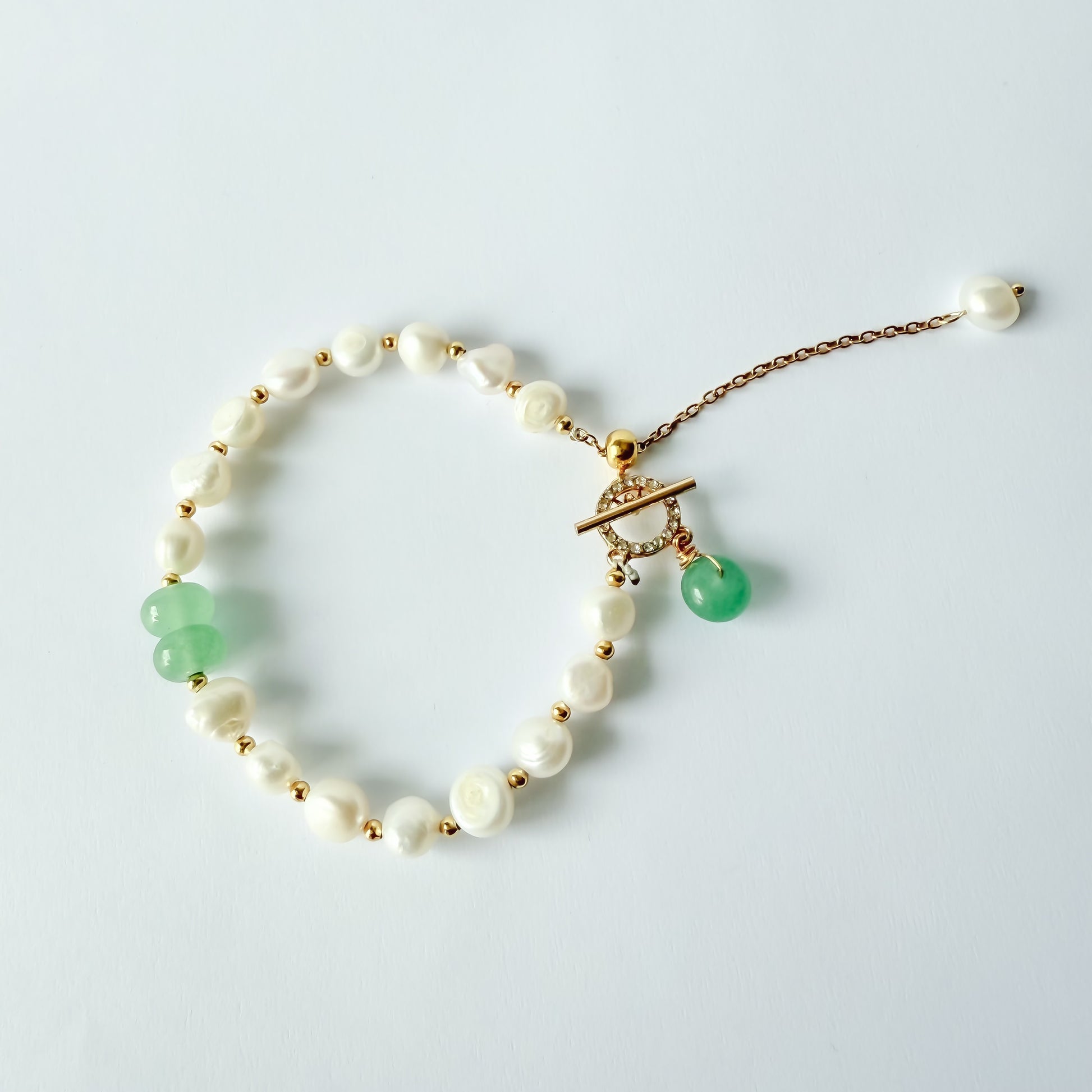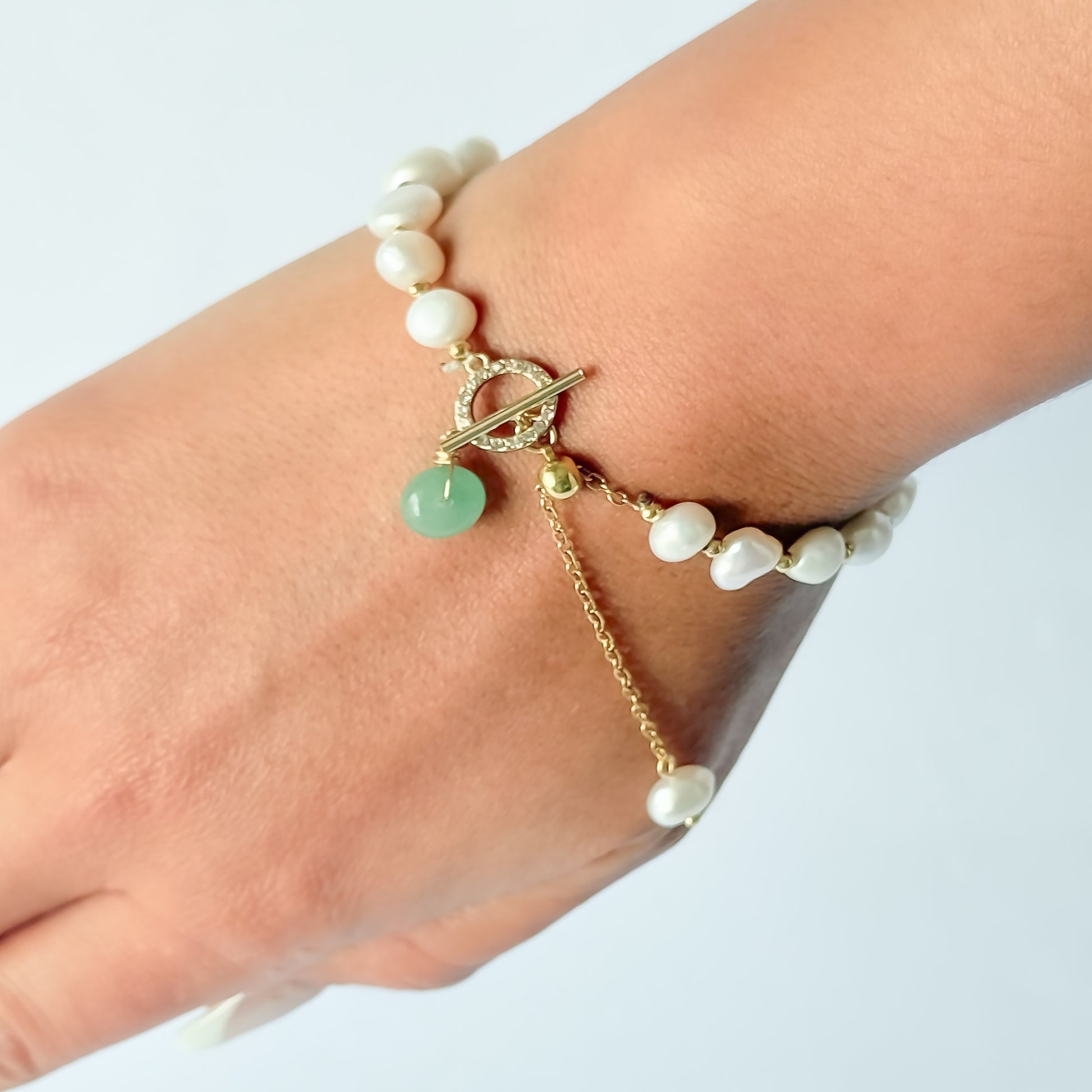 Pulsera Aura de acero inoxidable con baño de oro 18k, combina la elegancia atemporal de perlas naturales con brillantes imitación, Cada pieza está muy bien elaborada para garantizar un equilibrio perfecto entre luminosidad y refinamiento. Su diseño versátil complementa tanto atuendos casuales como formales, ofreciendo un toque de distinción a cualquier conjunto.